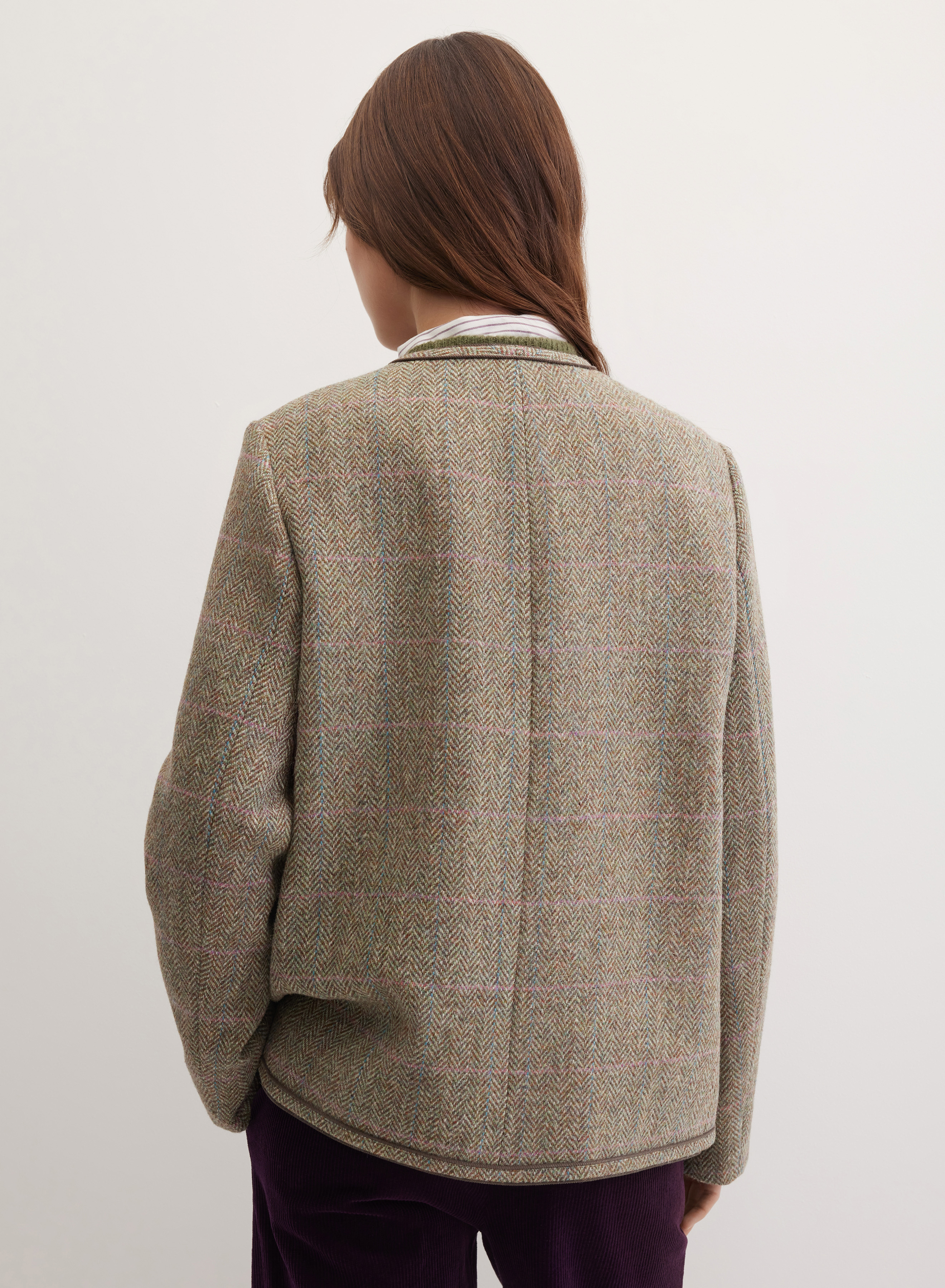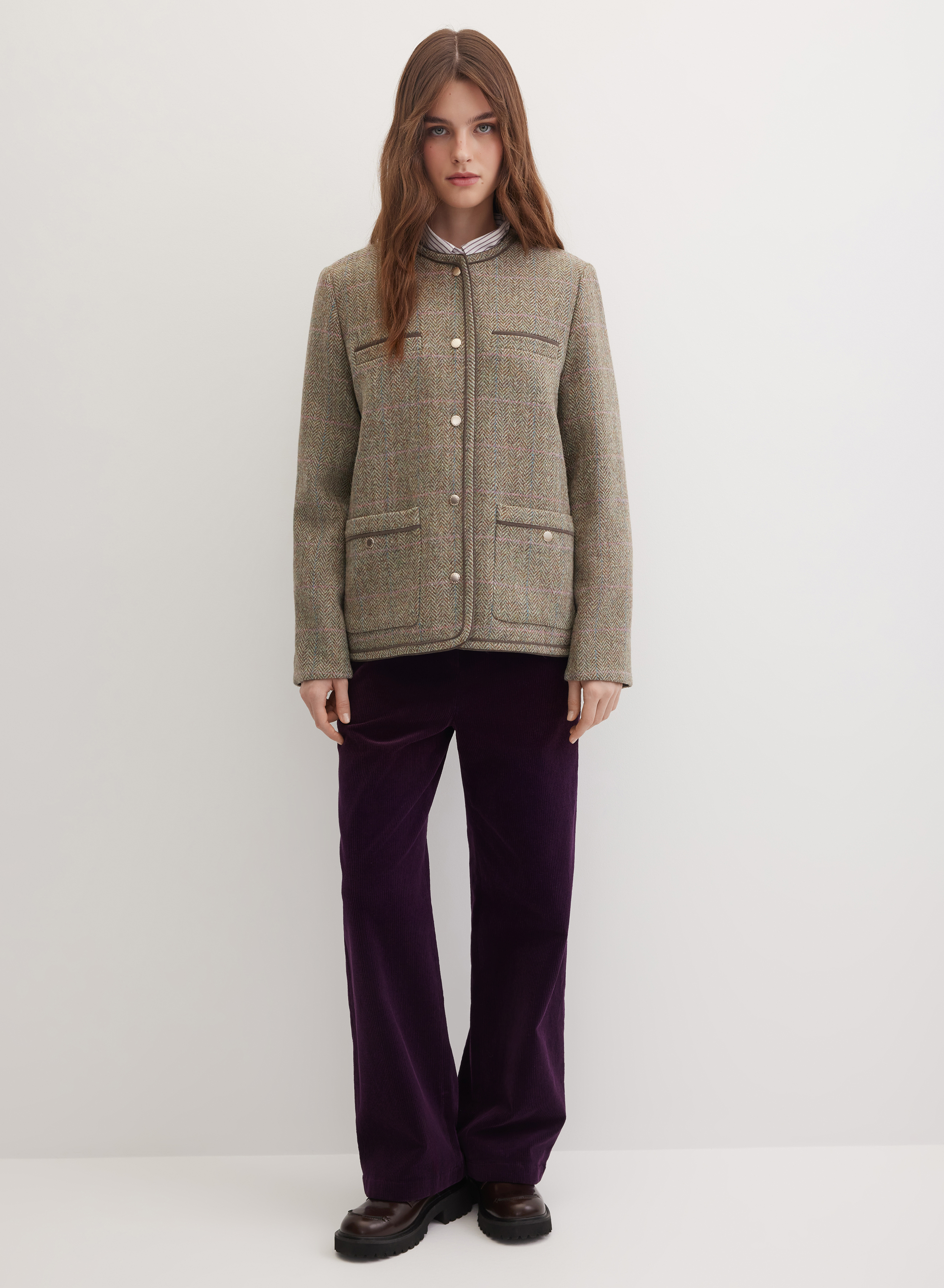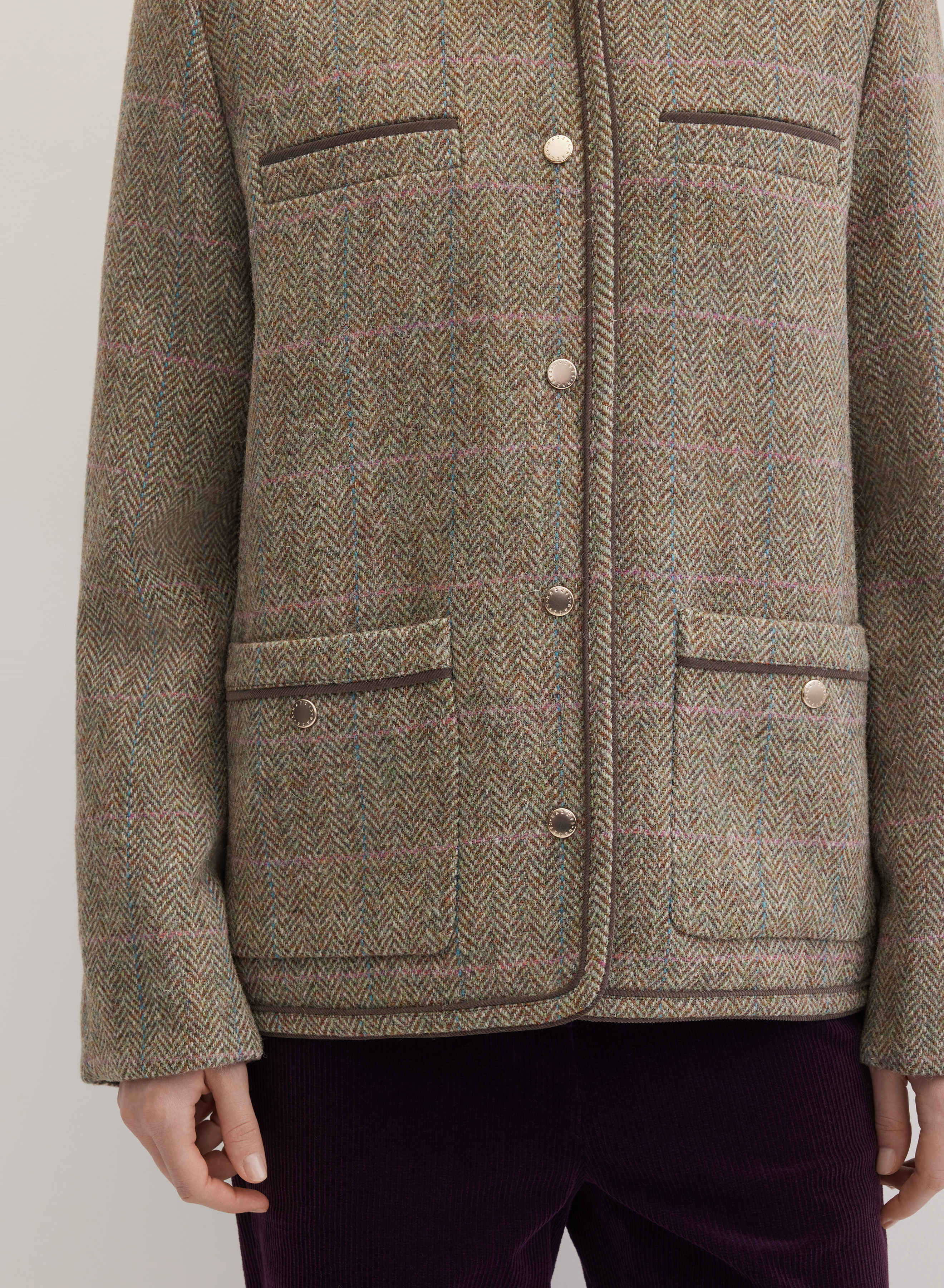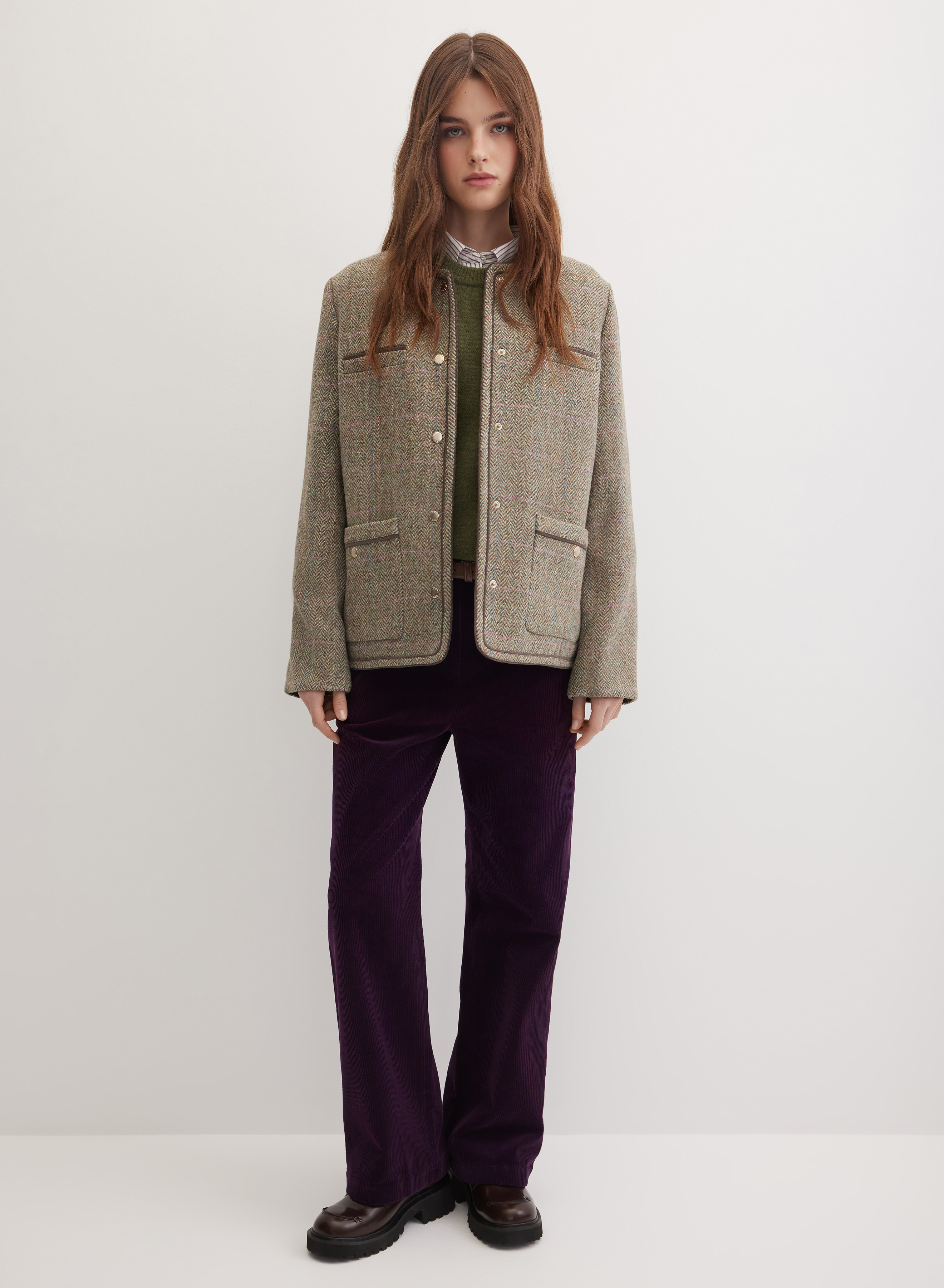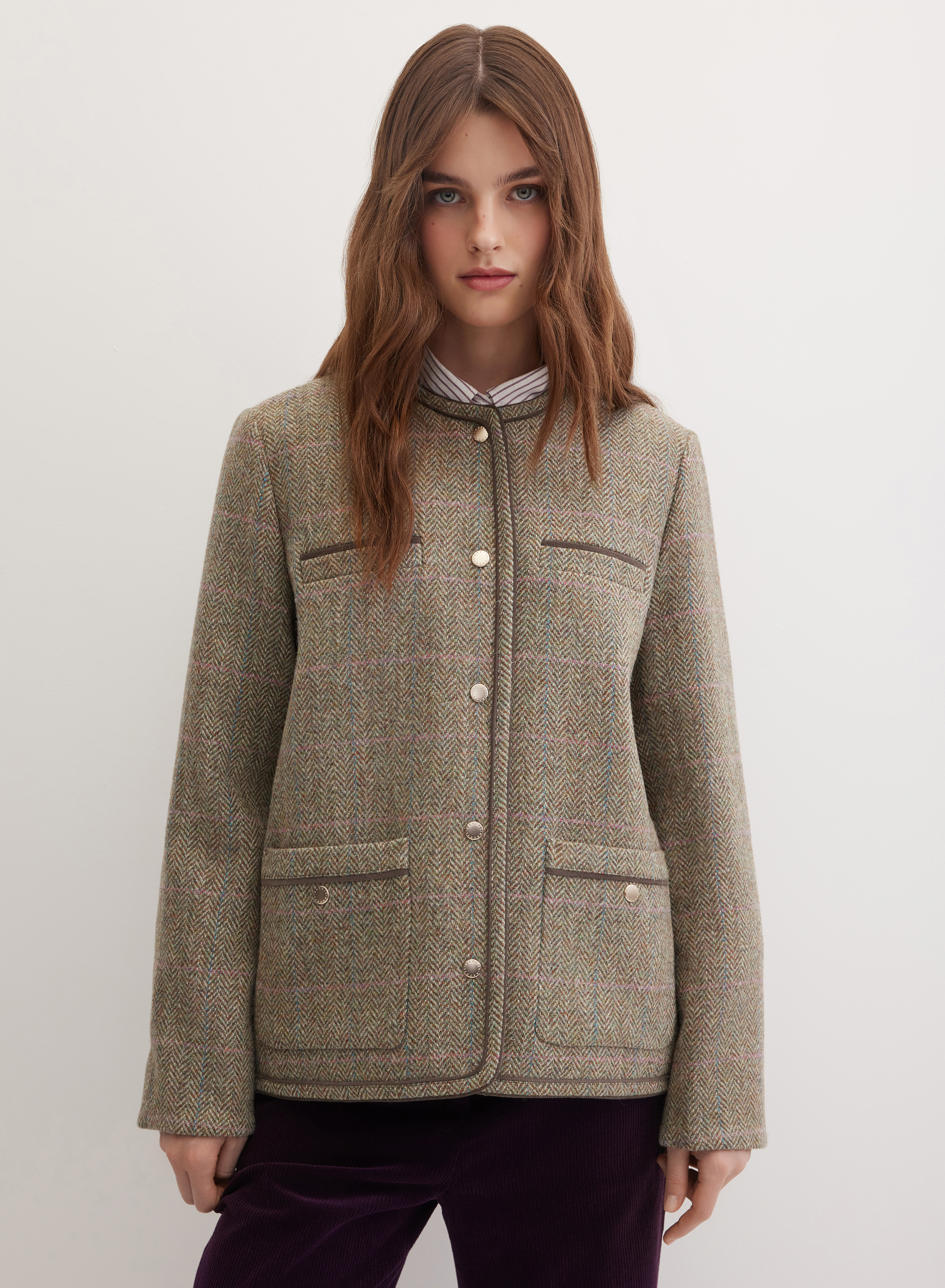 Модель выполнена из премиального костюмного твида с узором «елочка», который остается в центре модных показов на протяжении десятилетий. Плотная и пластичная шерстяная ткань хорошо согревает и опрятно выглядит в течение дня. Фактурная подкладка обеспечивает дополнительную защиту от ветра и сохраняет форму изделия.