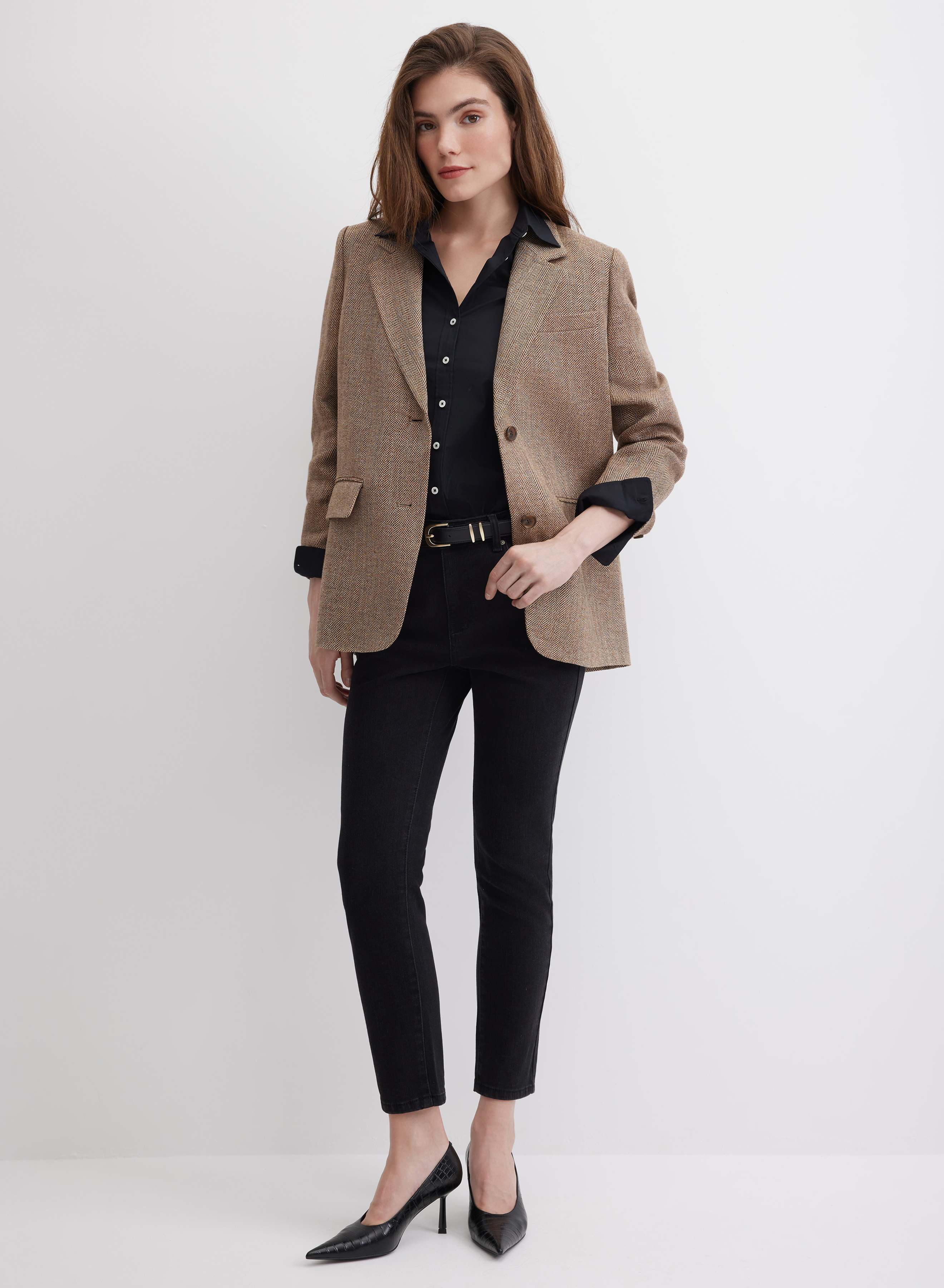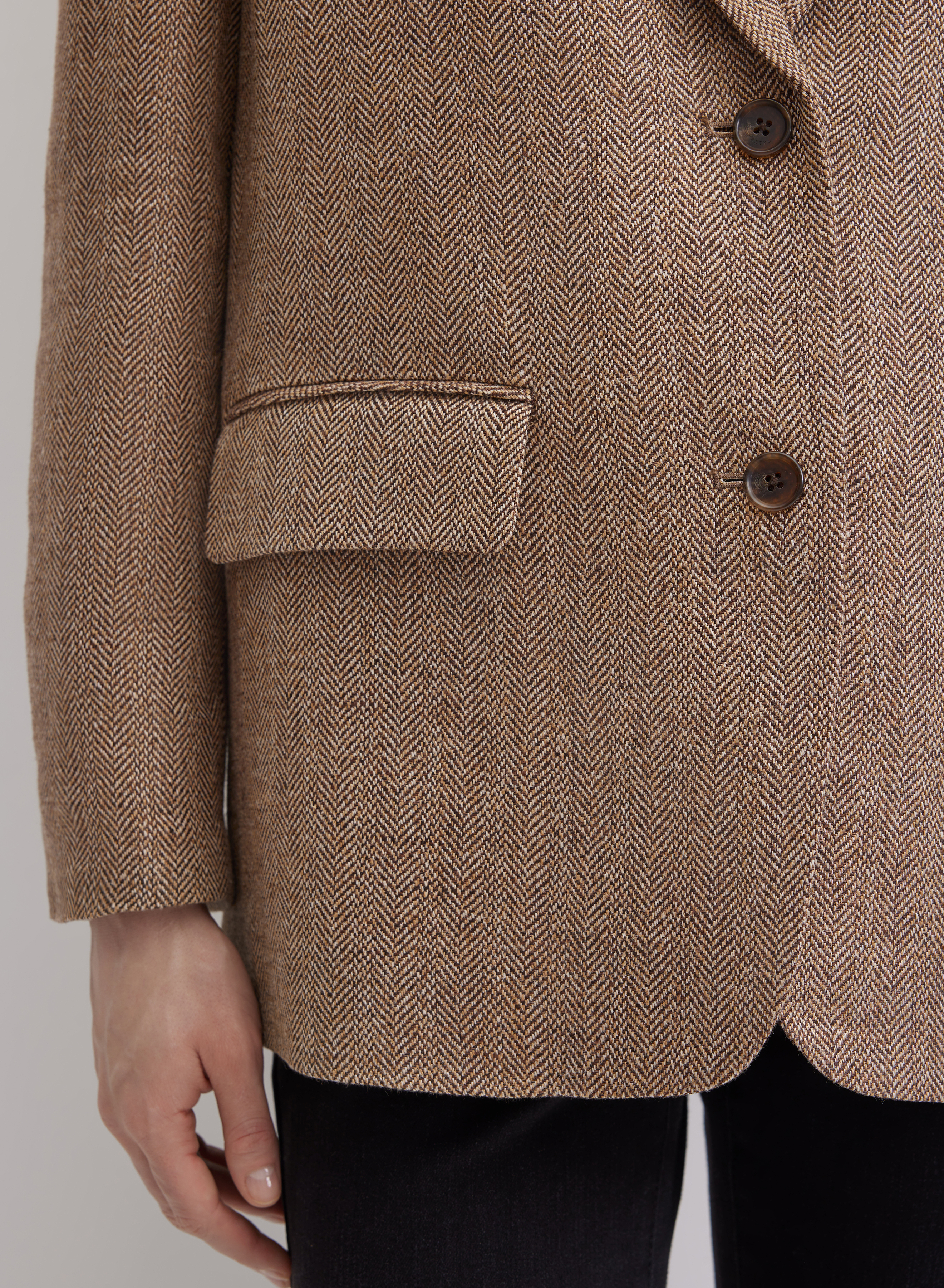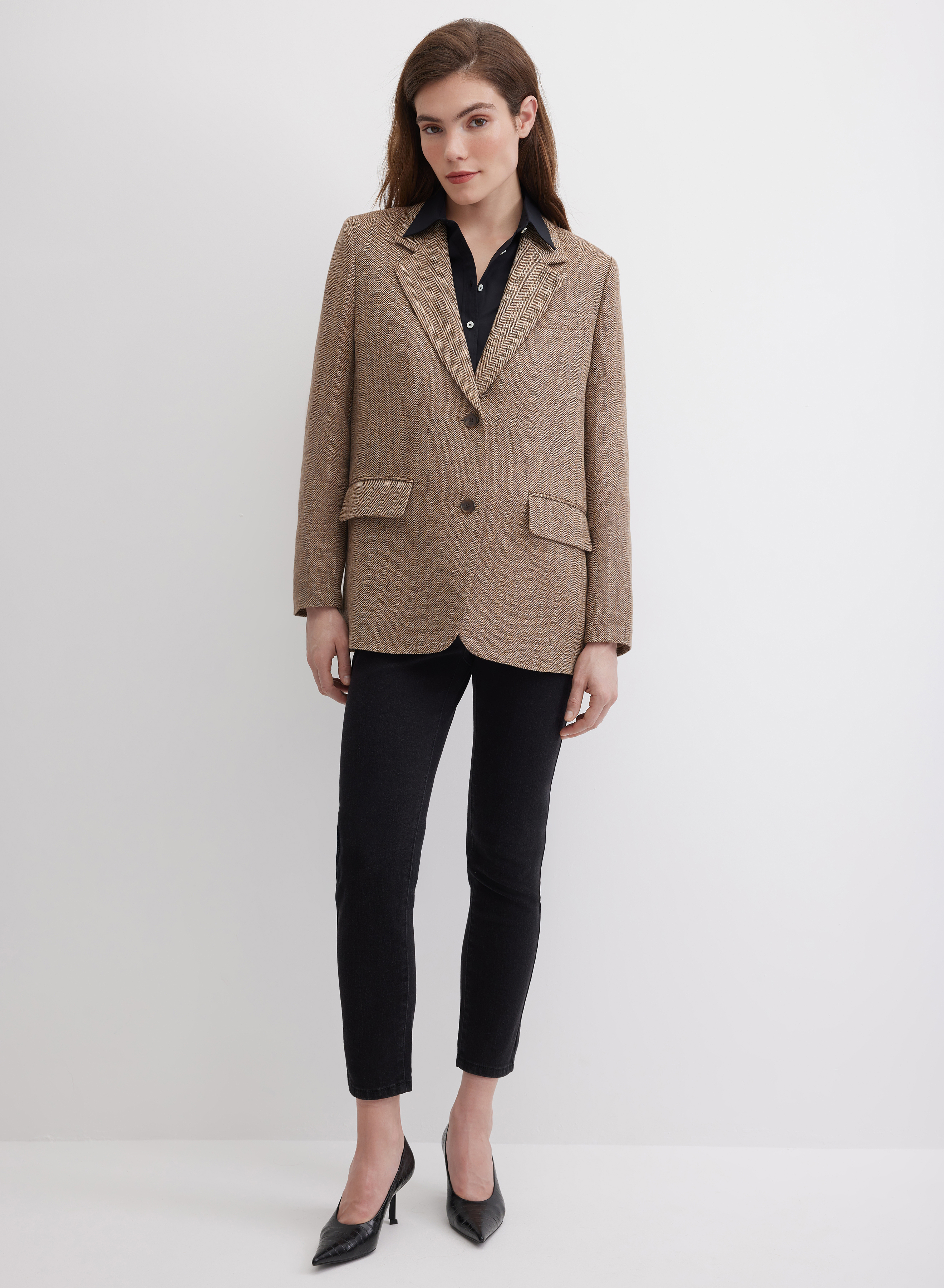 Лаконичный и стильный однобортный женский классический жакет. Отрезные по линии плеча рукава слегка заужены. Аккуратные полочки закруглены по нижней кромке. Отложной воротник с небольшими лацканами отстрочен дополнительной строчкой, поддерживающей его форму. Застегивается на две крупные пуговицы. По бокам впереди расположены два врезных кармана с клапанами.