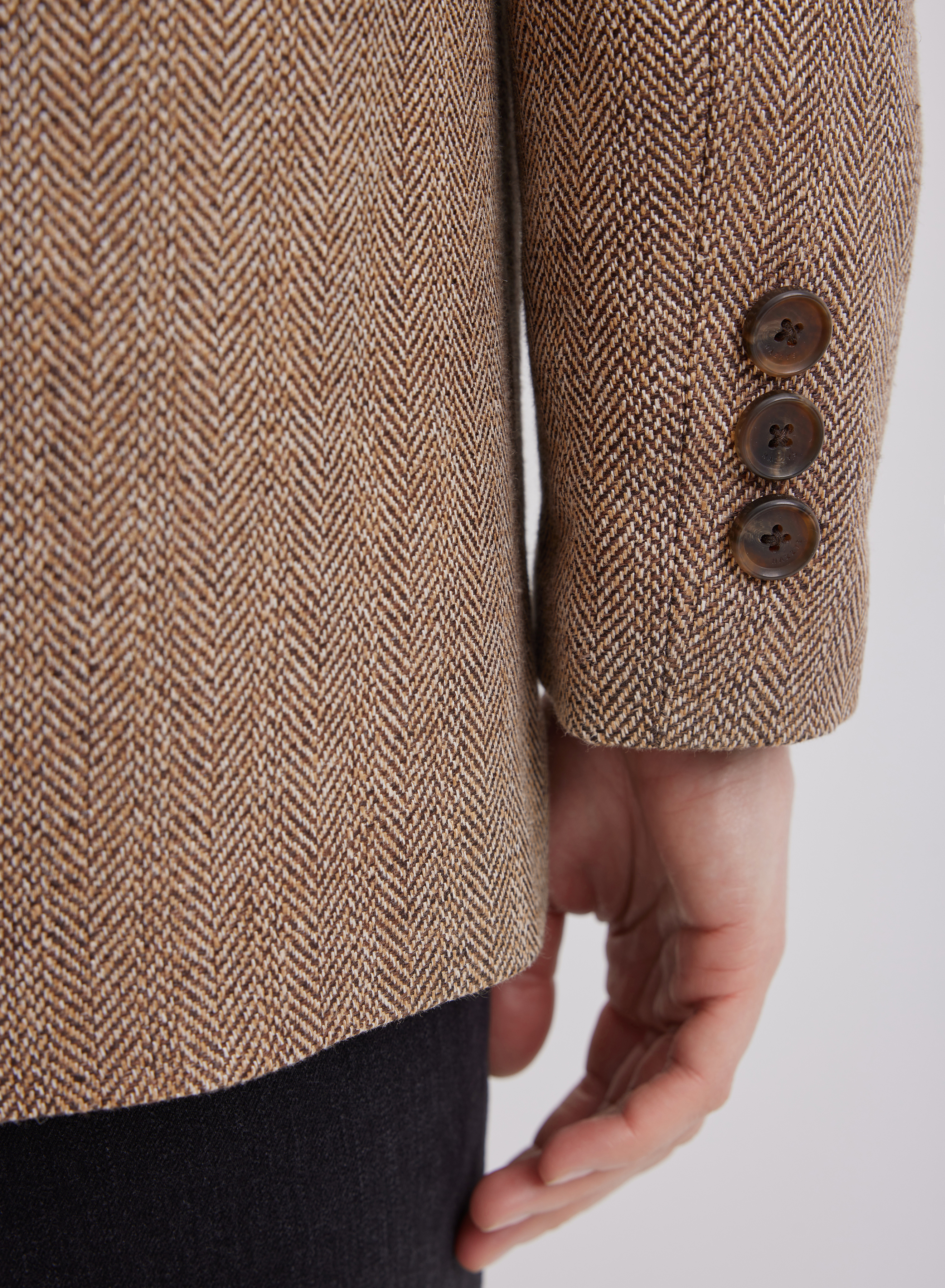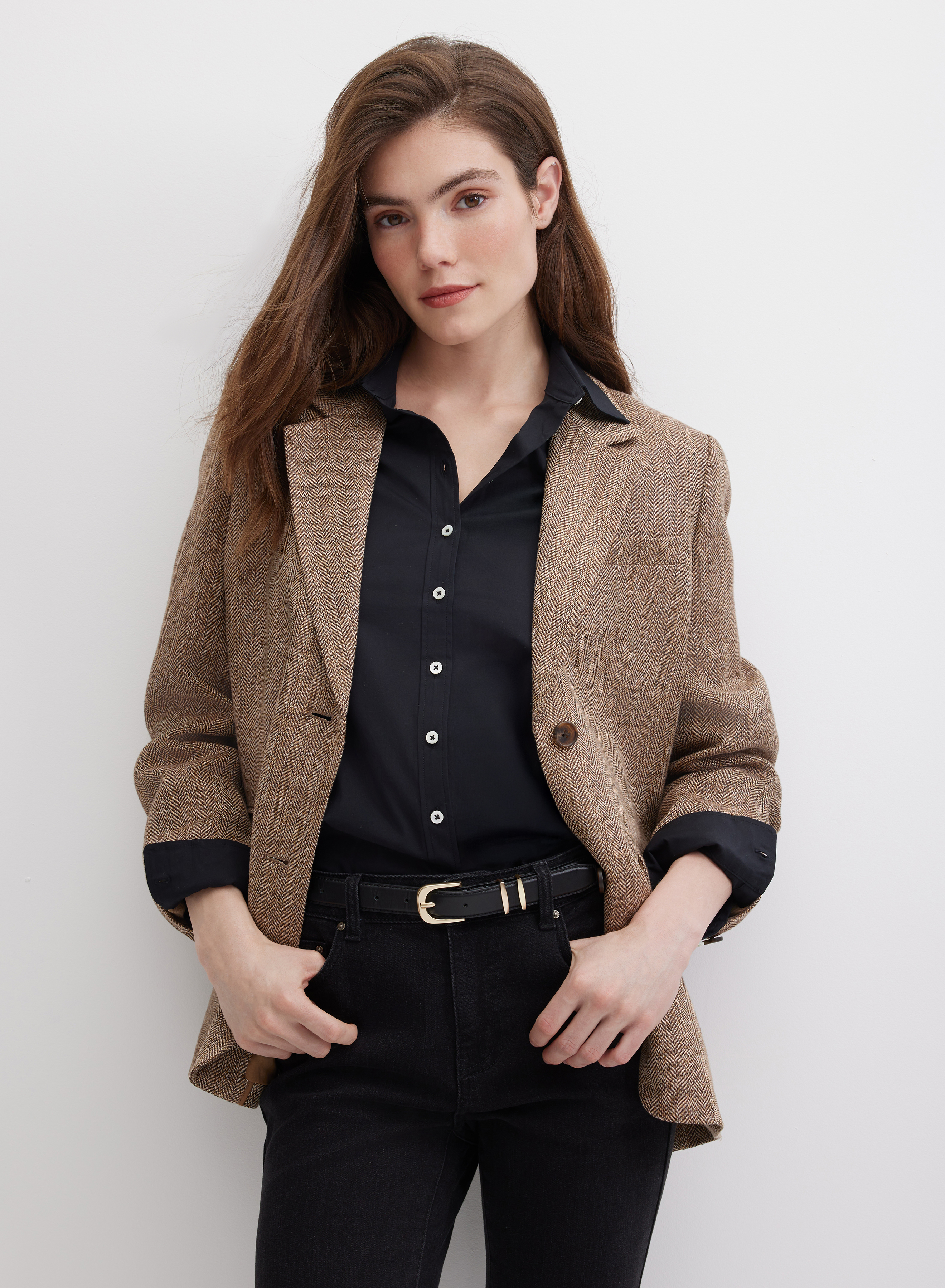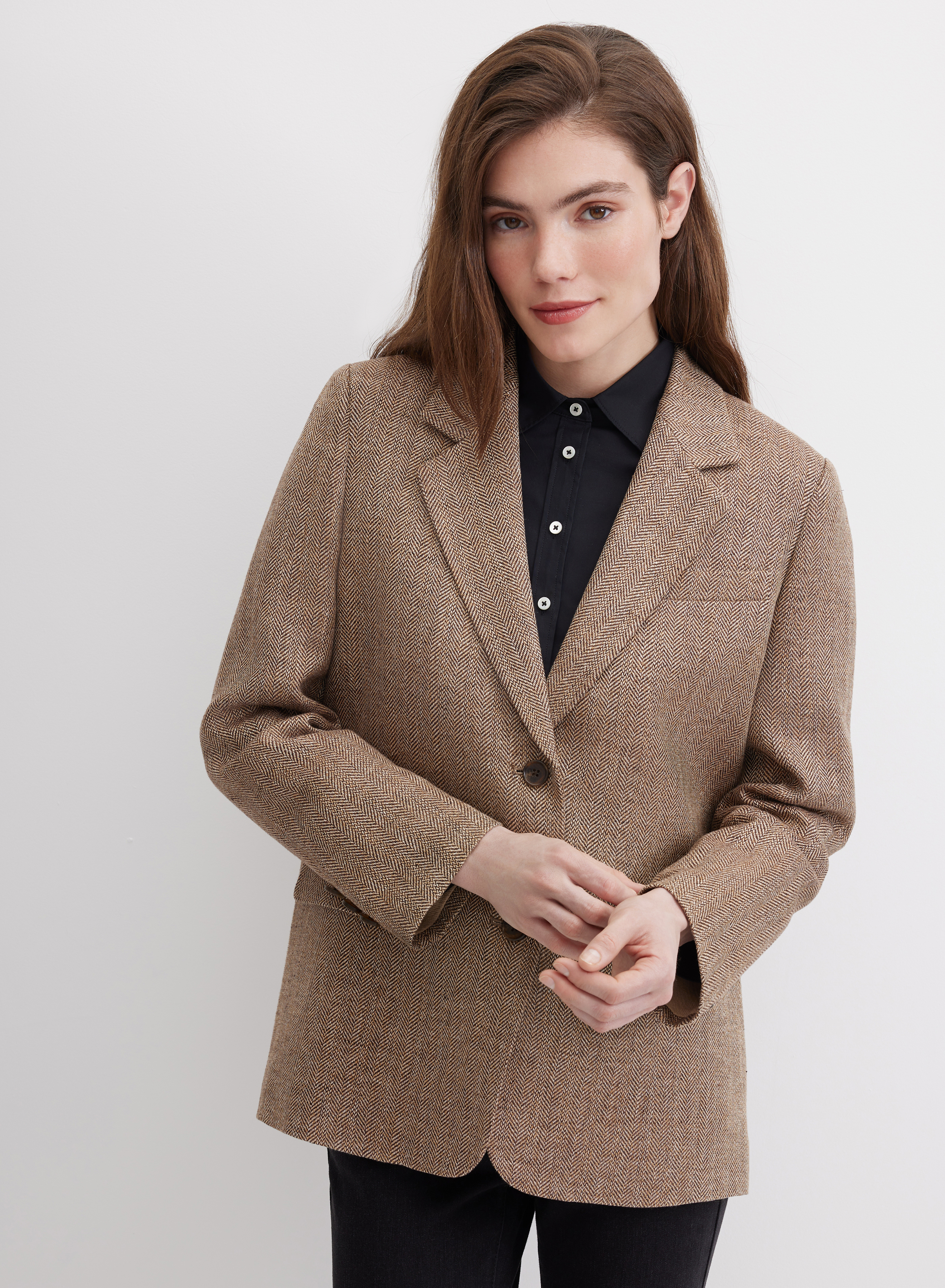 Лаконичный и стильный однобортный женский классический жакет. Отрезные по линии плеча рукава слегка заужены. Аккуратные полочки закруглены по нижней кромке. Отложной воротник с небольшими лацканами отстрочен дополнительной строчкой, поддерживающей его форму. Застегивается на две крупные пуговицы. По бокам впереди расположены два врезных кармана с клапанами.